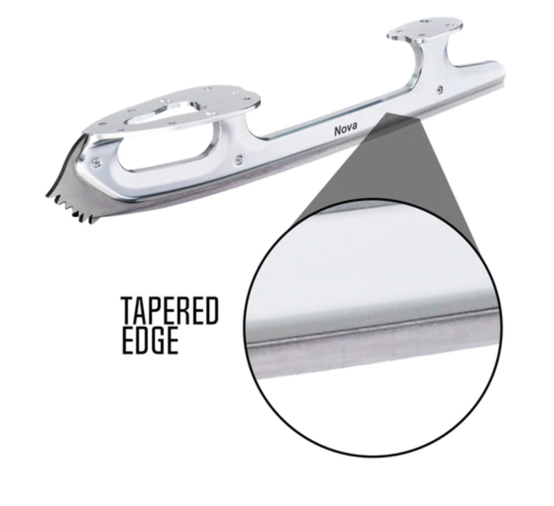 Available in Silver, Gold, Black, Pink or Lilac. Matrix is up to 33% lighter than traditional blades! Reduced weight means reduced fatigue and with stainless steel runners, our blades have harder edges to hold edges longer. All pick patterns are identical to those on our Ultima blade models, allowing seamless transition AUS8 Stainless steel runner is maintenance free and holds edges longer for a longer lasting blade Runner is inset into chassis and permanently secured using 3 axels Parallel chassis allows for accurate sharpening MATRIX NOVA BLADE FEATURES AND BENEFITS: Cross cut picks Tapered design provides deeper, precise edges and longer sharpening life Stainless steel runner holds edges longer Standard heel Advanced competition profile Freestyle/pairs usage 7' Rocker 7/16" Radius of Hollow